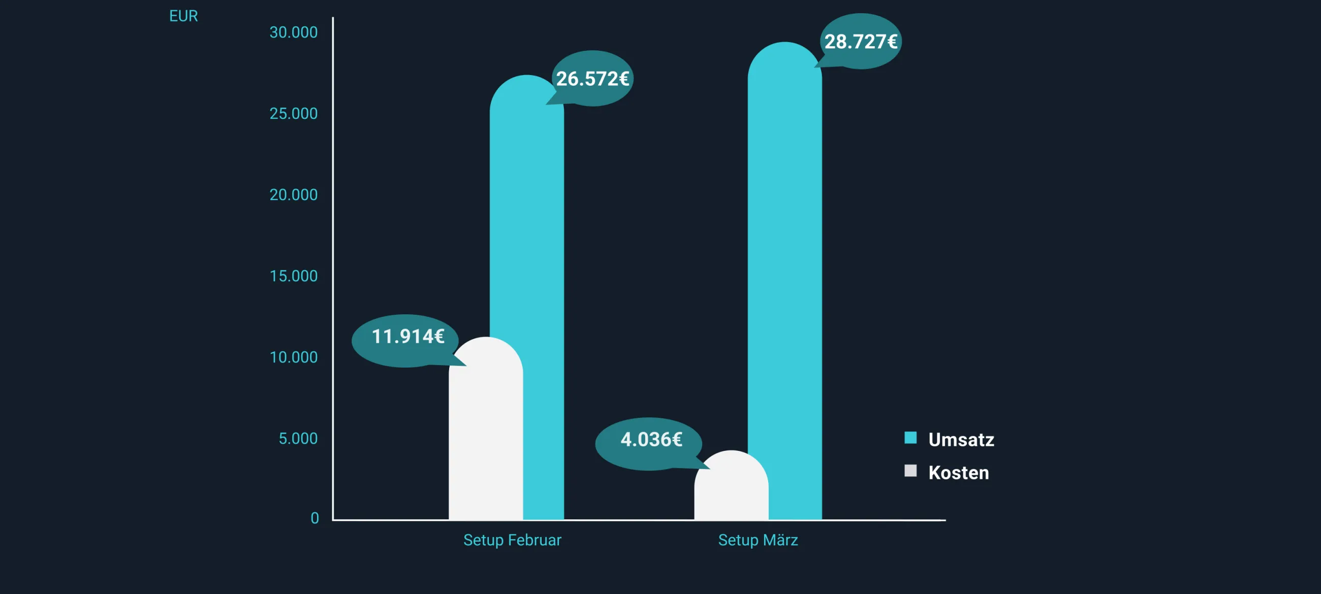 Durch BlueOak-DRWN AI Optimierung konnten die Kosten stark gesenkt und der Umsatz leicht erhöht werden. Der ROAS stieg von 2,24 auf 7,12.